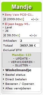 Bij het drukken van "Bewaar/Open mandje", kunt u de aankopen bewaren en later terug opvragen. Deze optie moet wel door de administrator actief worden geplaatst.